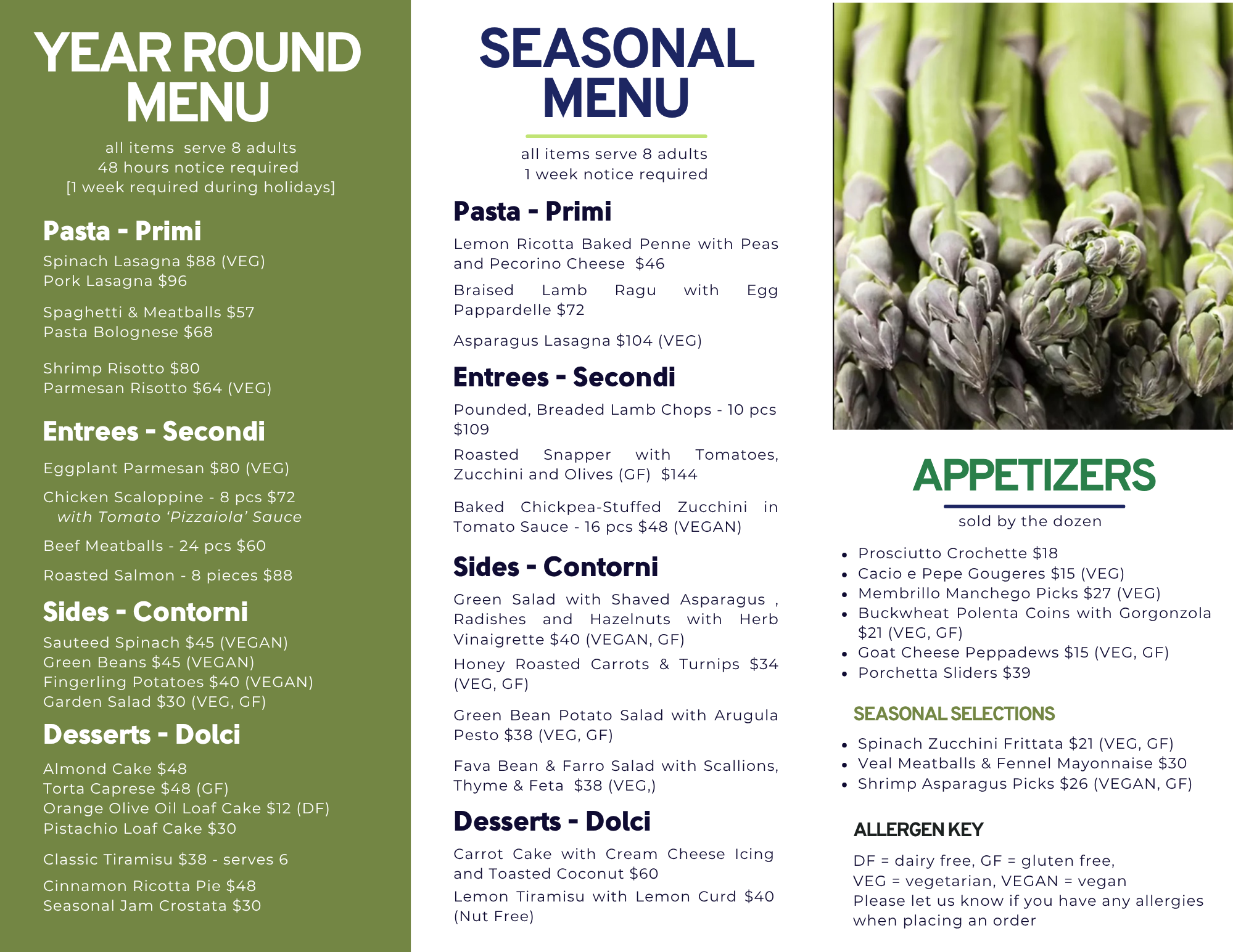 The staff at our Aurora Street kitchen make delicious prepared foods that are available to take home. While we keep stock of items from our classic menu, our kitchen always makes seasonal specialties so call ahead (410–820–8281) or check our Instragram to find out what’s available today. Here is a sampling of our classic menu items: